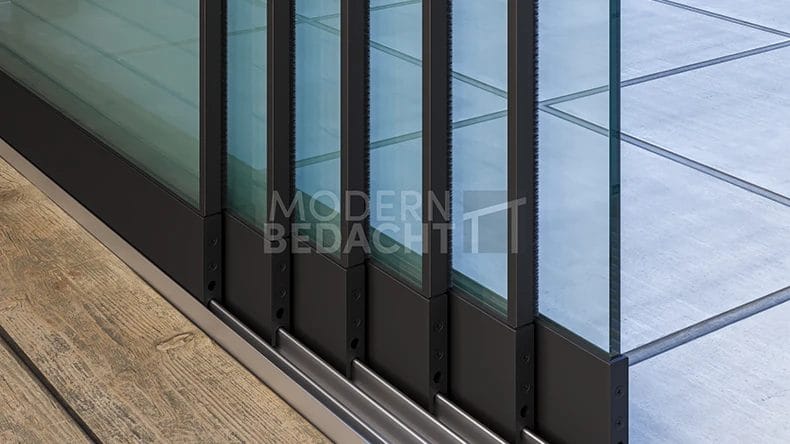ModernBedacht liefert die Glasschiebewände als kompletten Bausatz mit allen benötigten Standardkomponenten. Die Schienen lassen sich mit einfachen Schrauben sowohl auf Terrassenplatten als auch an bestehenden Konstruktionen befestigen.